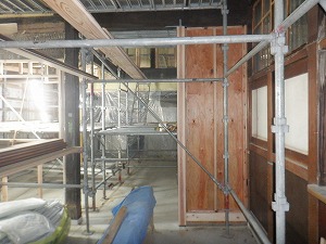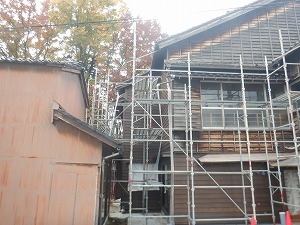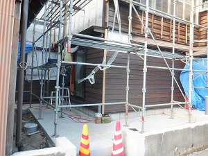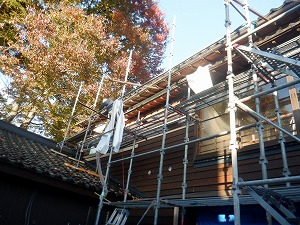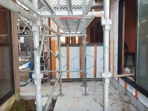 | 2025/9/30 外部足場組立 和室廻り外壁の下見板張りが始まります。 |