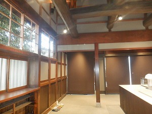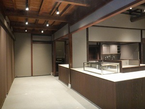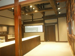 物販スペースから工場棟入口 上部吹き抜けに美しい架構が残っています。 |